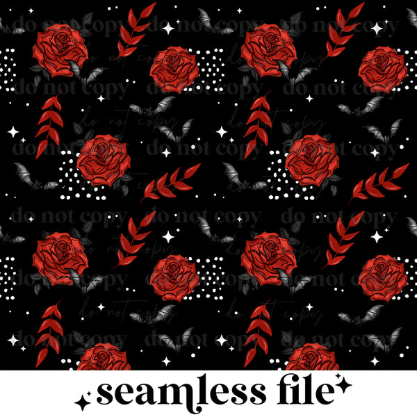 Pattern of red roses and black bats on a black background with 'do not copy' text.